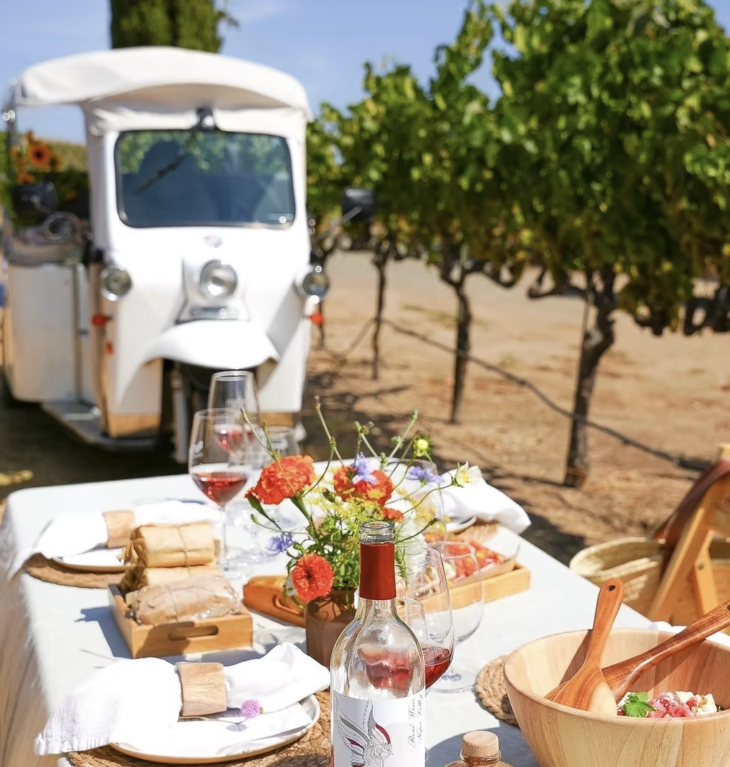 For groups up to 12 this is by far the easiest and best way for a bachelorette party or corporate event. They’ll pick you up downtown Napa in cool 3 wheeled tuk-tuks and whisk you away along the back roads of Napa. Already fun, right? Then a few stops at hidden gem wineries and the grand finale, a gourmet picnic right in the vineyards.